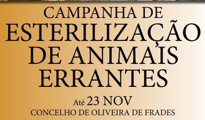 O Município de Oliveira de Frades informa que se encontra a decorrer a Campanha de Esterilização de Animais Errantes no concelho de Oliveira de Frades até ao próximo dia 23 de novembro. Para mais informações deverá contactar a Câmara Municipal. Tlf: 232 760 300 Email: gabinetedeapoio@cm-ofrades.com